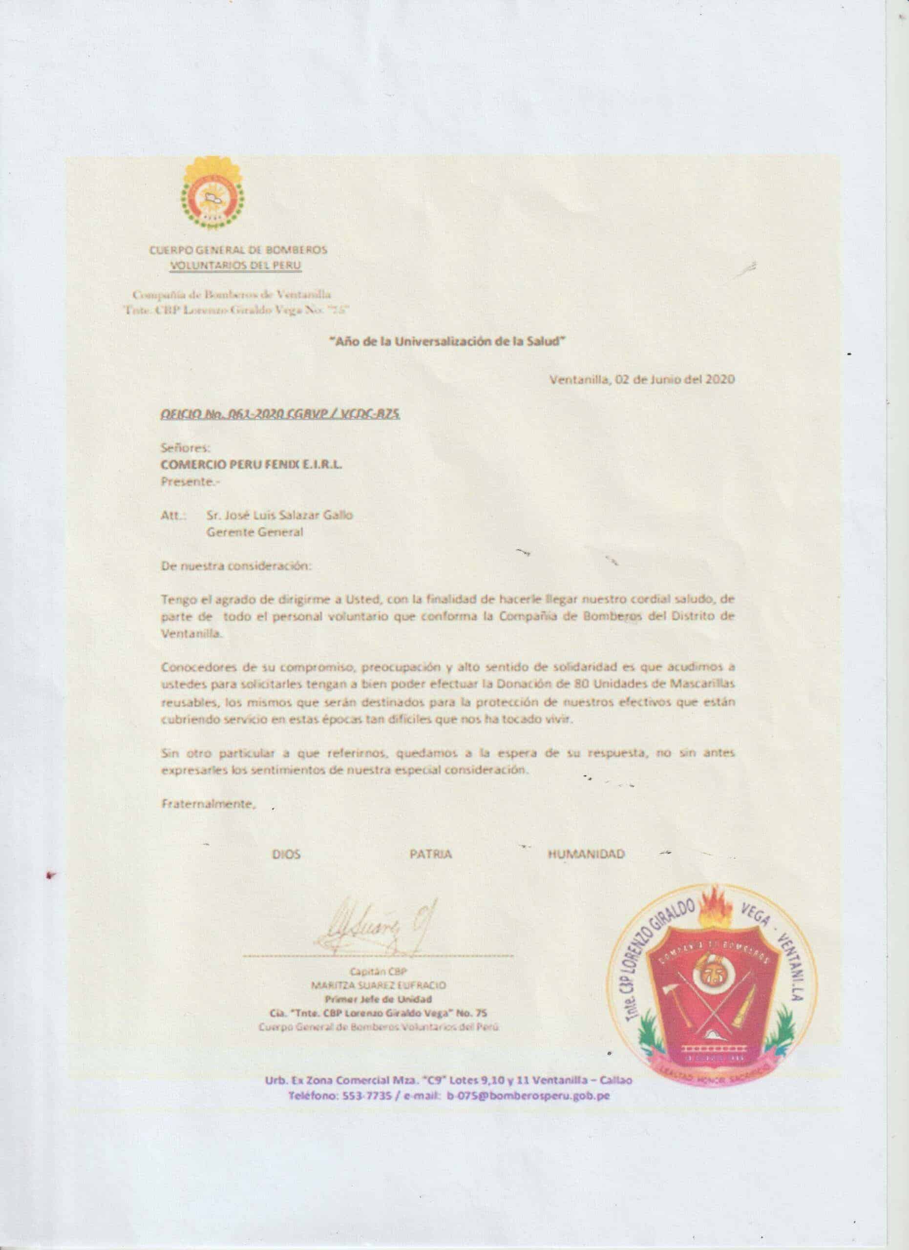 Responsabilidad Social Porque nos importas tú y nos importa todo el Perú, siempre apoyando a quien más lo necesita. Algunas de Nuestras Donaciones Cartas de Donaciones Donación de 500 mascarillas y insumos a la comisaría de Surco en Lima