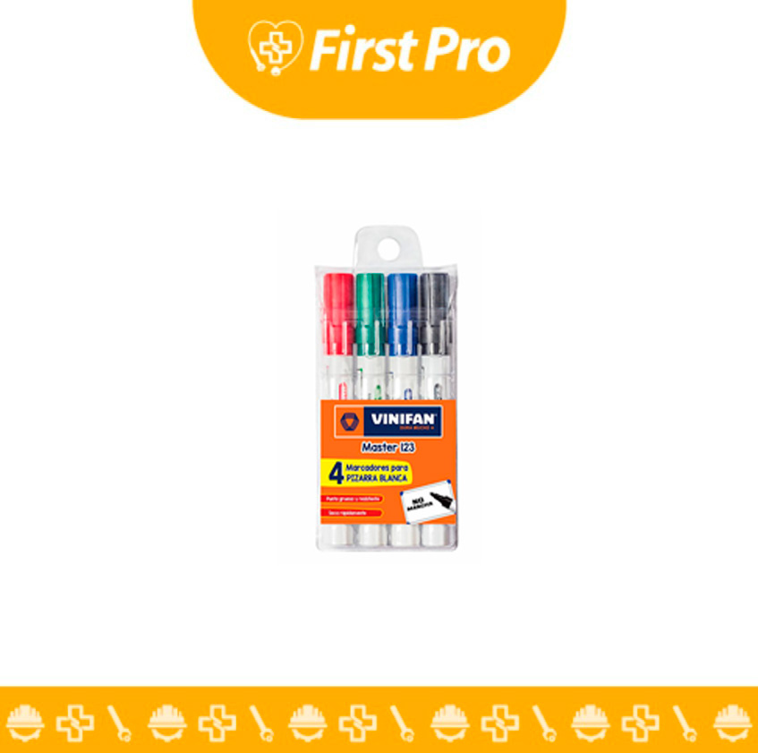 Kit Plumón Pizarra Vinifan 123 x 4 UND: Set de cuatro plumones de borrado en seco para pizarra acrílica. Colores básicos: Negro, Azul, Rojo y Verde. Tinta de bajo olor, trazo fluido y fácil limpieza sin dejar manchas. Ideal para aulas y oficinas.